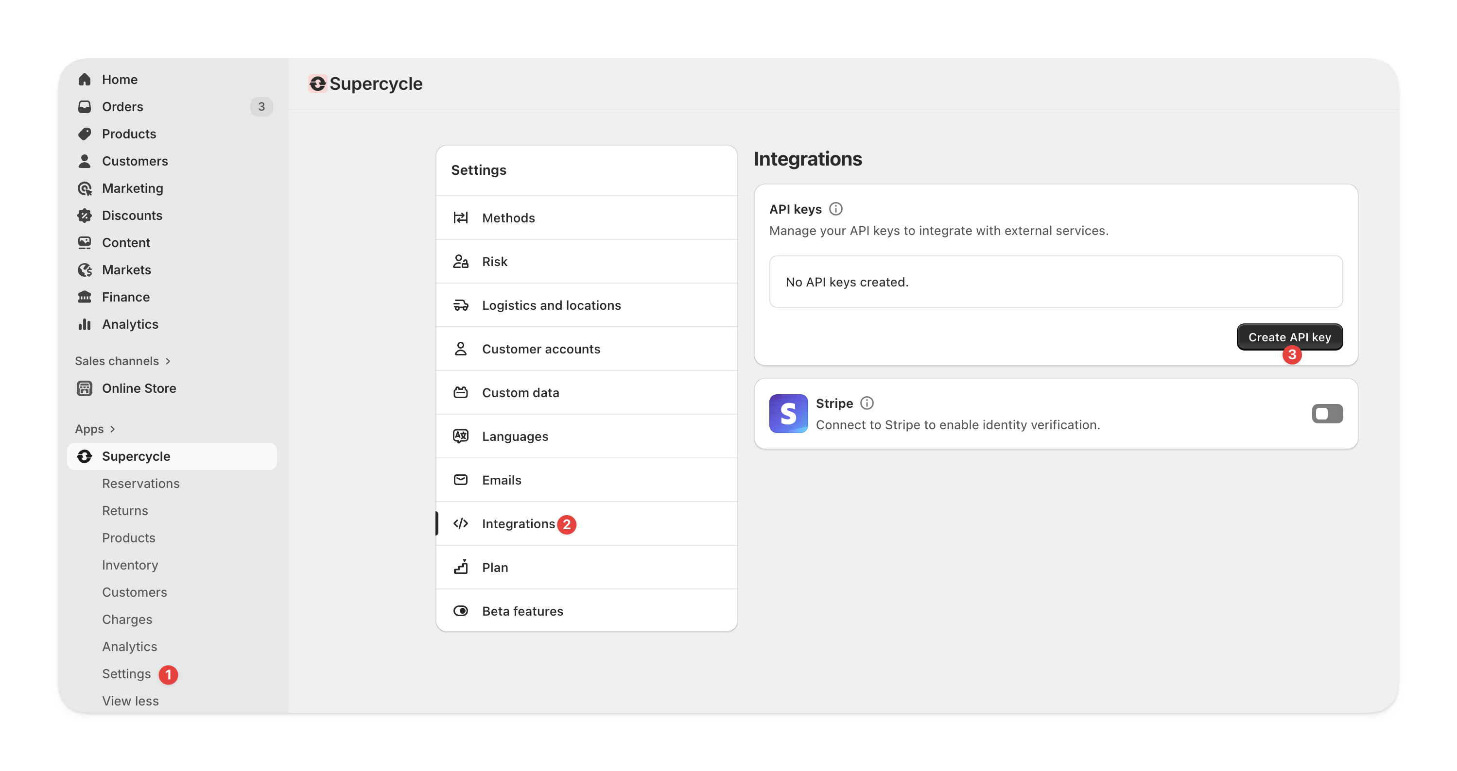 In your Shopify admin, navigate to Supercycle > Settings > API.Select Create API key.