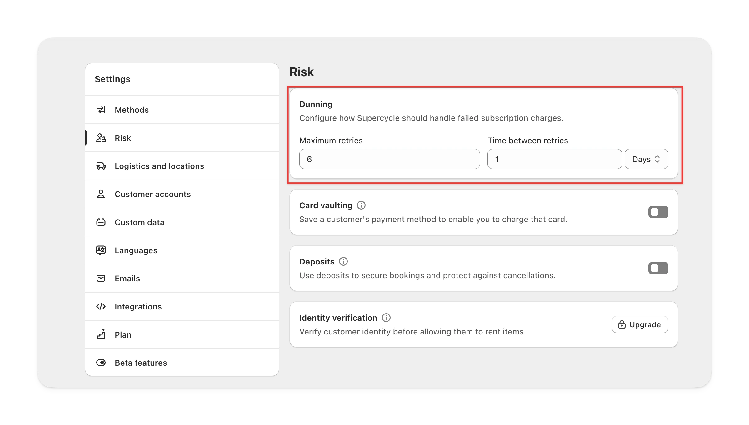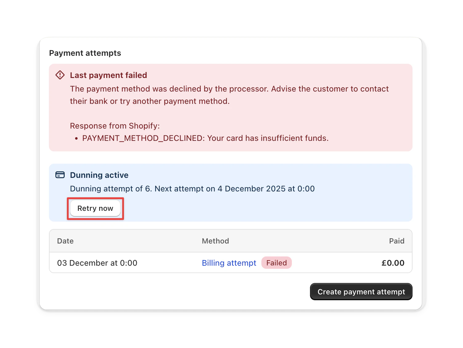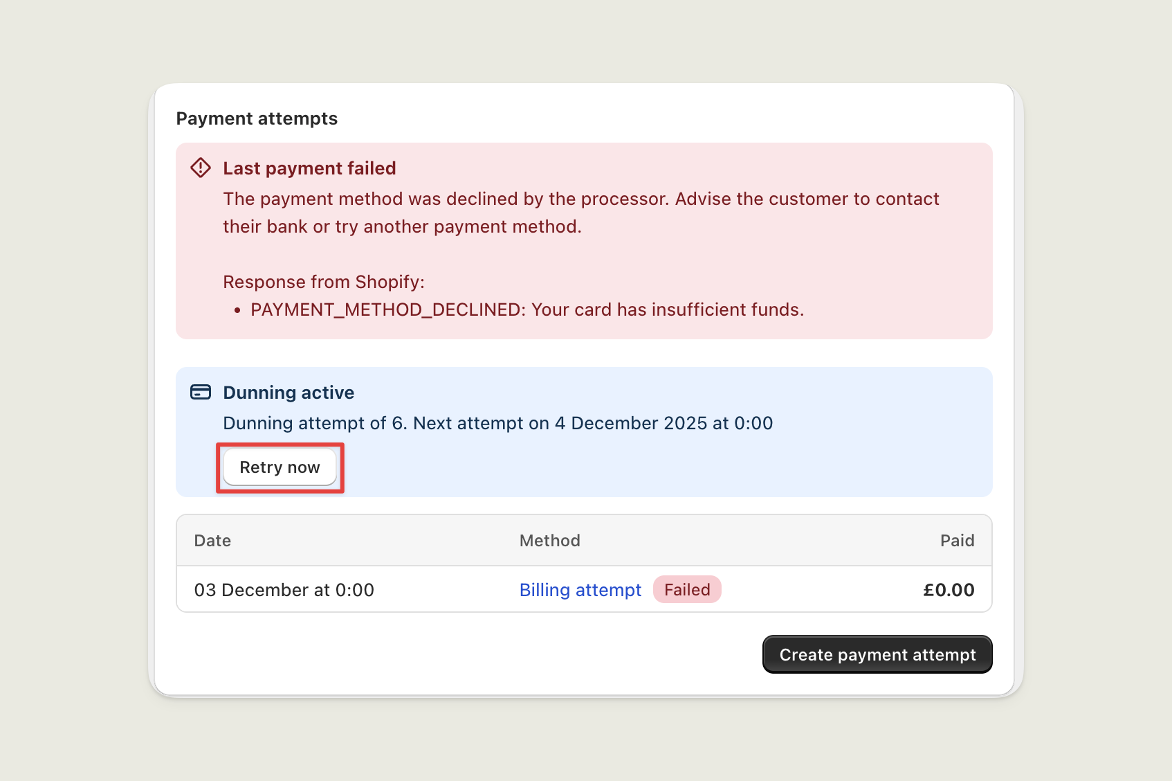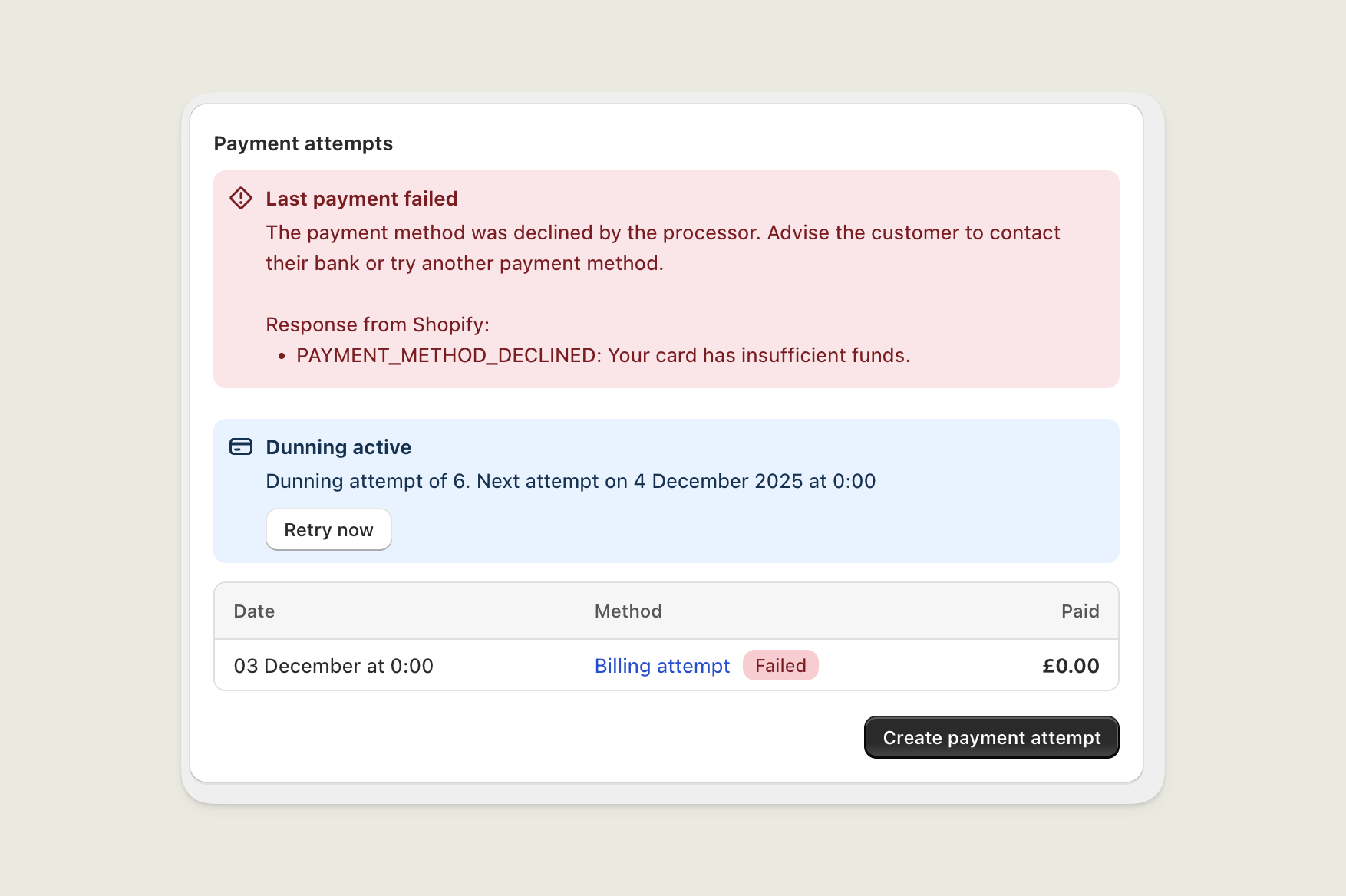 Dunning is triggered when a recurring billing attempt fails. Supercycle creates billing attempts for recurring charges, and if Shopify cannot process the payment, dunning automatically begins. Learn more in Payment attempts.Which methods it applies to