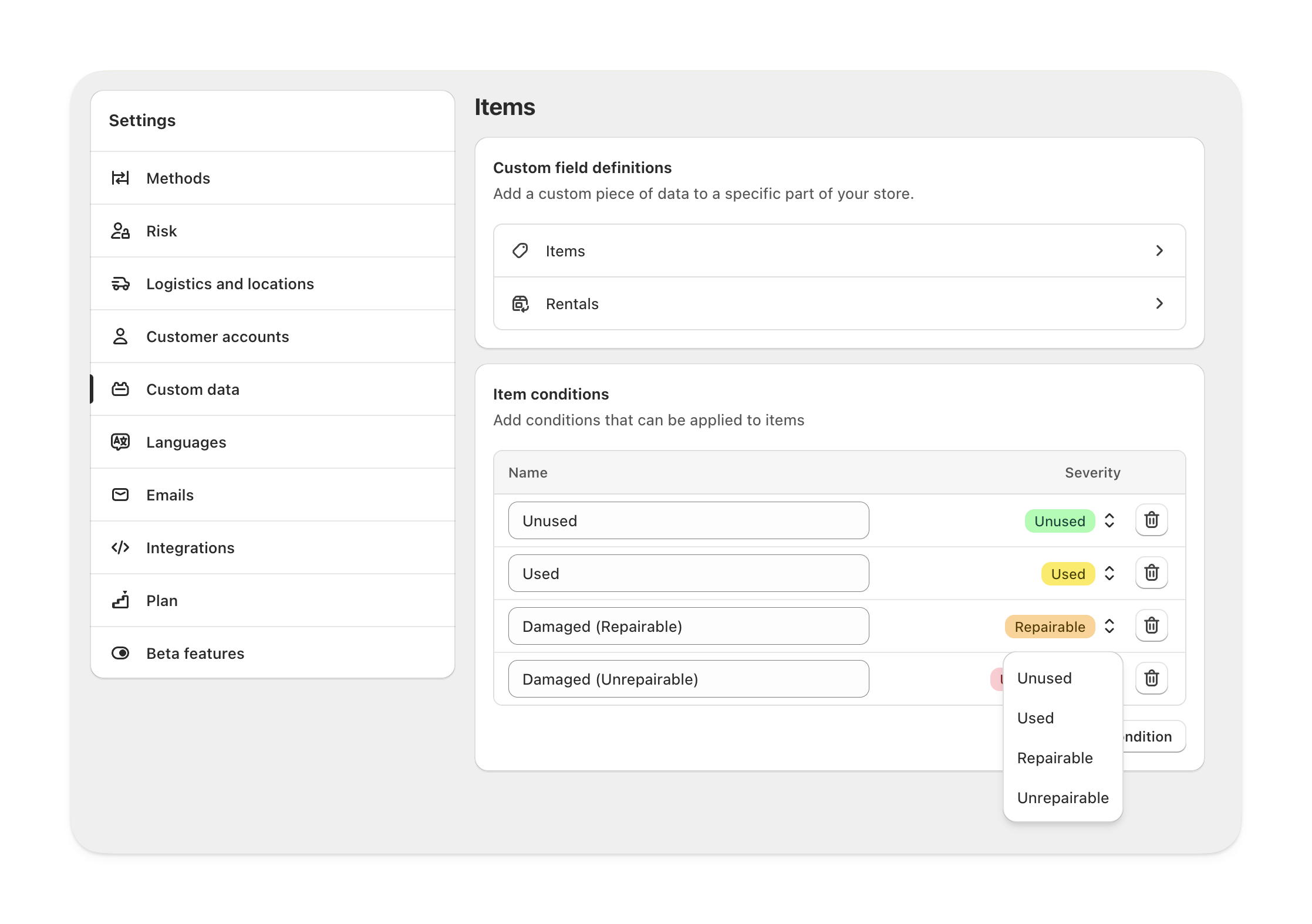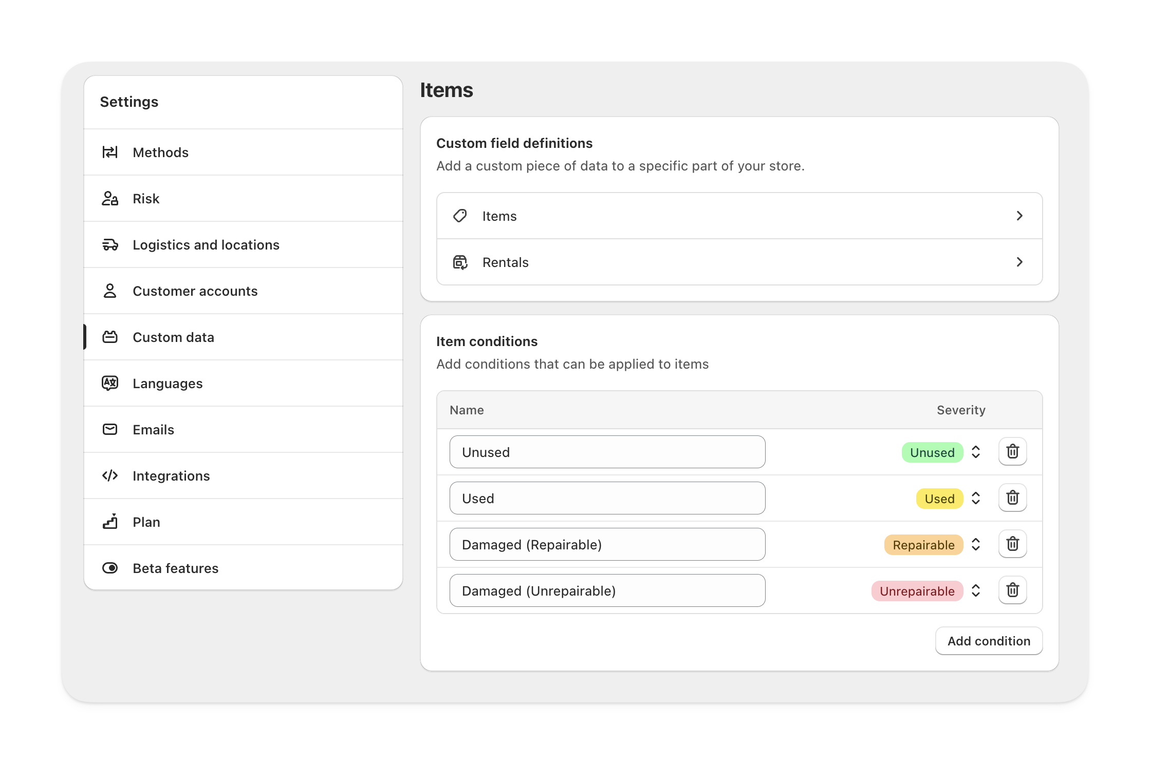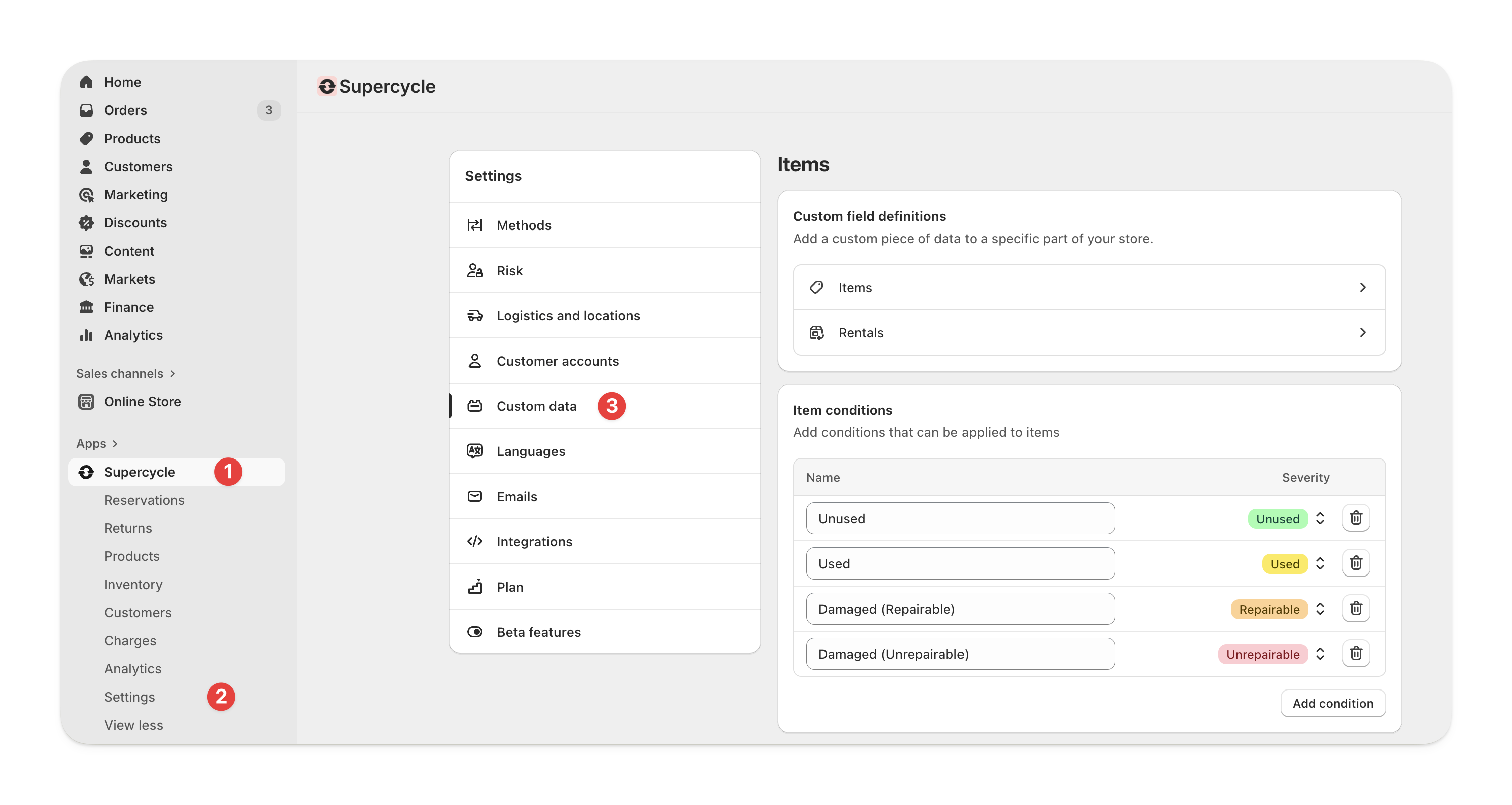 In Shopify Admin, head to Supercycle > Settings > Item conditions.