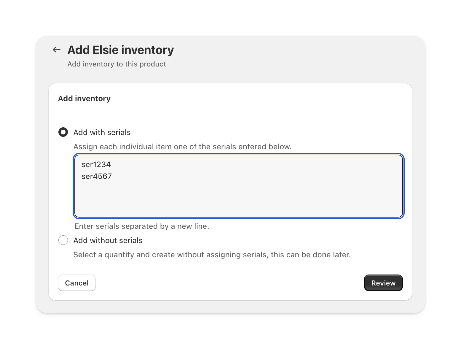 On the next page, add a serial number on a new line for each item you’d like to create.Alternatively, select Add without serials and enter a number of items. You can add serials to the newly created items later from their item page.