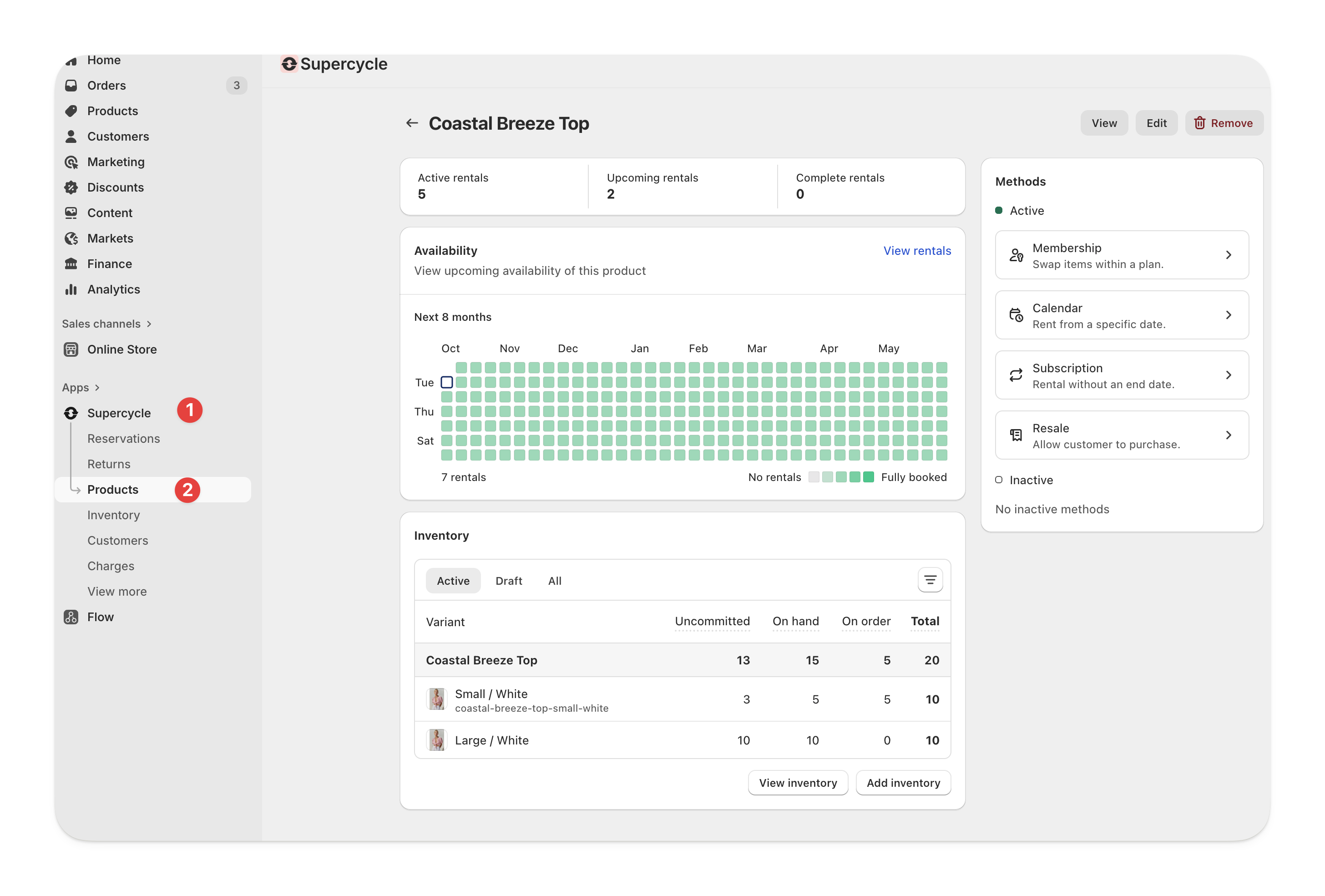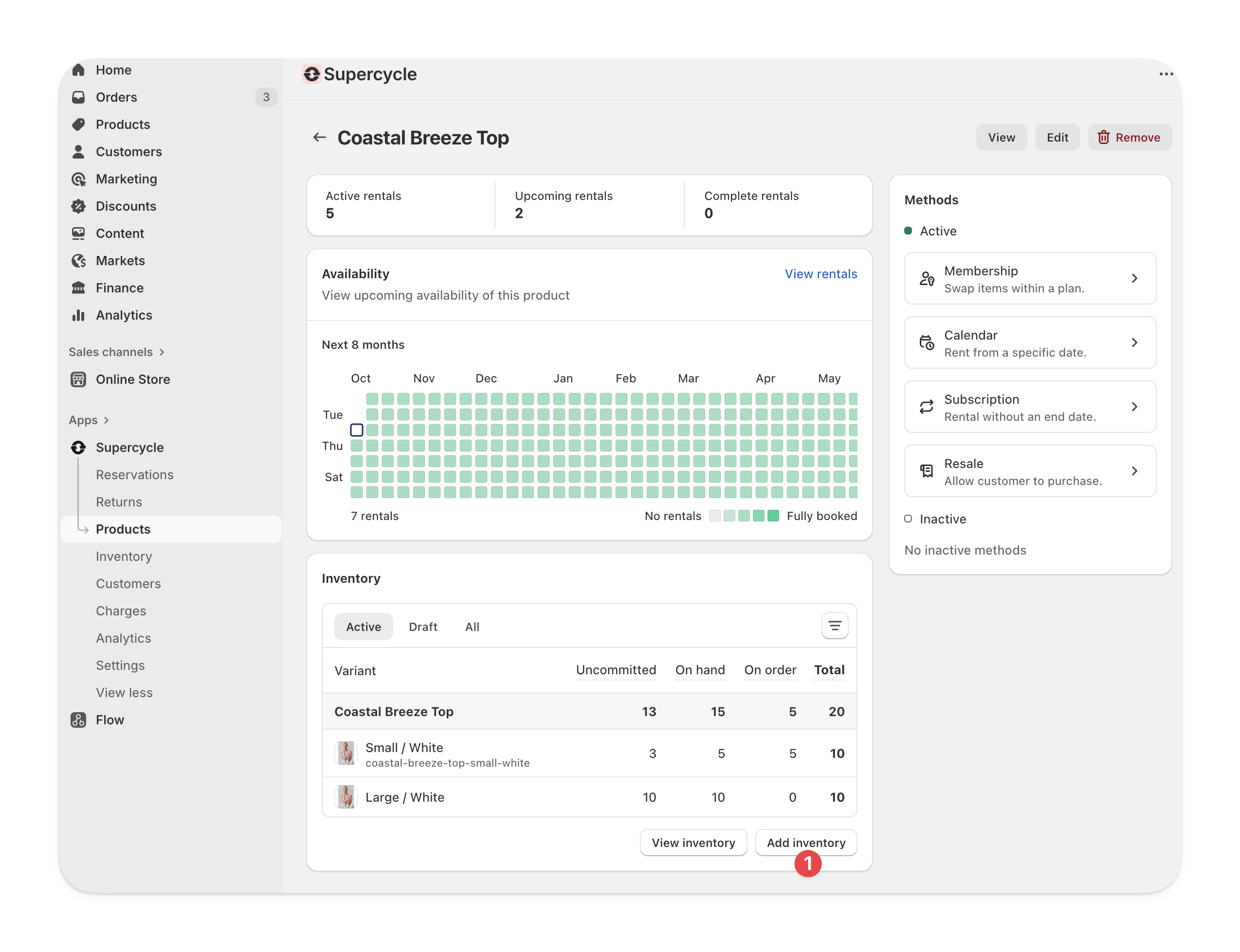 You should create inventory inside your Supercycle product, not your Shopify product, as Supercycle is responsible for inventory management after import.In bulk, from a Product