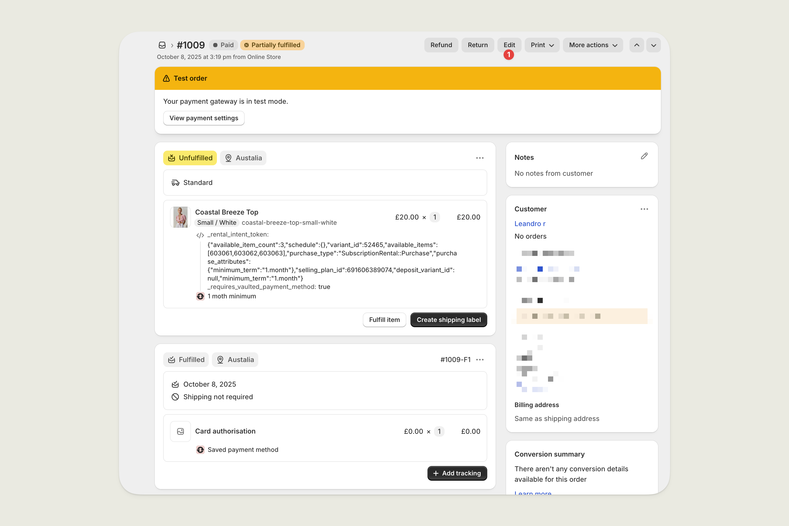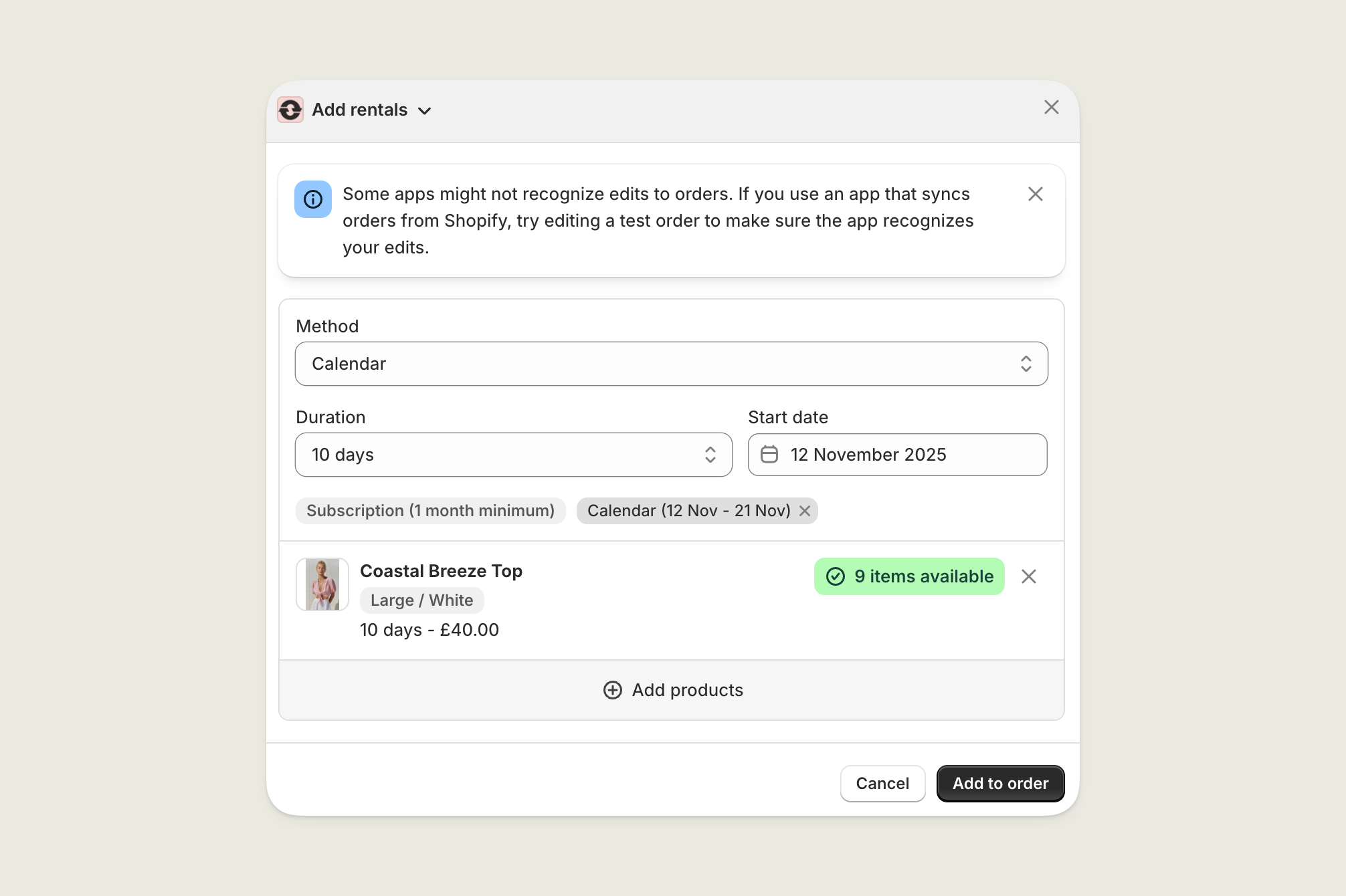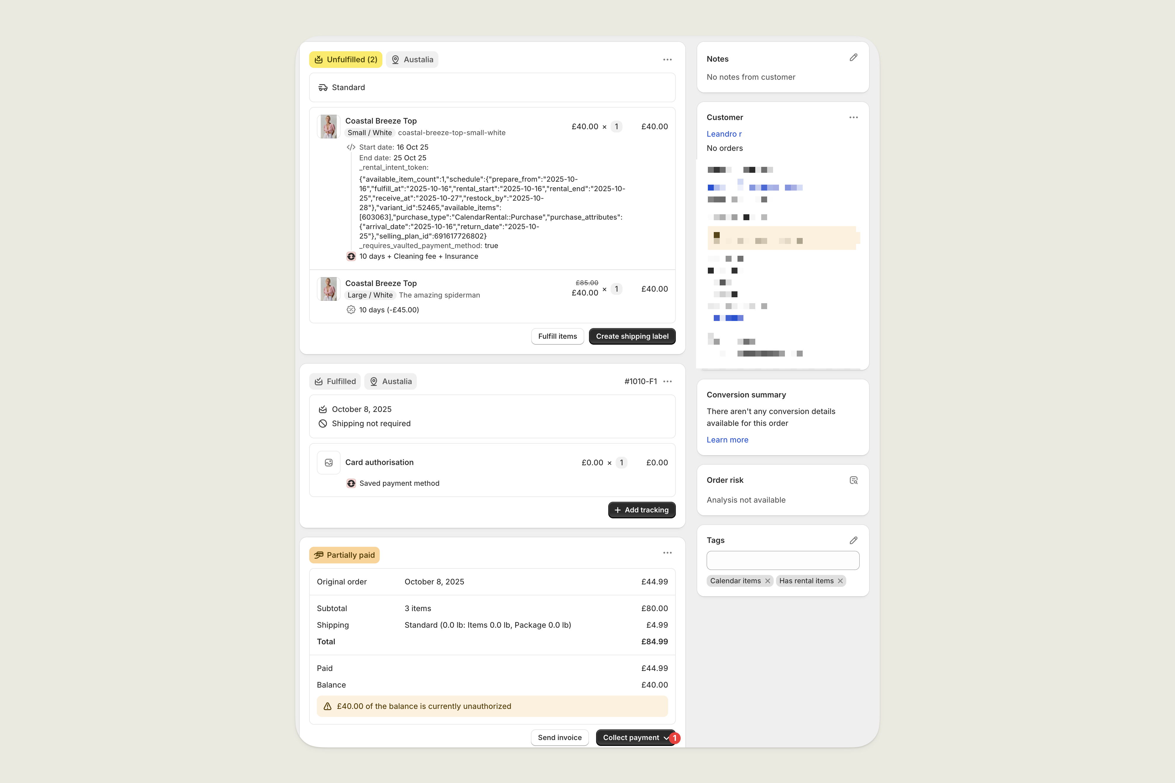 If adding rentals increases the total order value, Shopify will show the outstanding balance.1