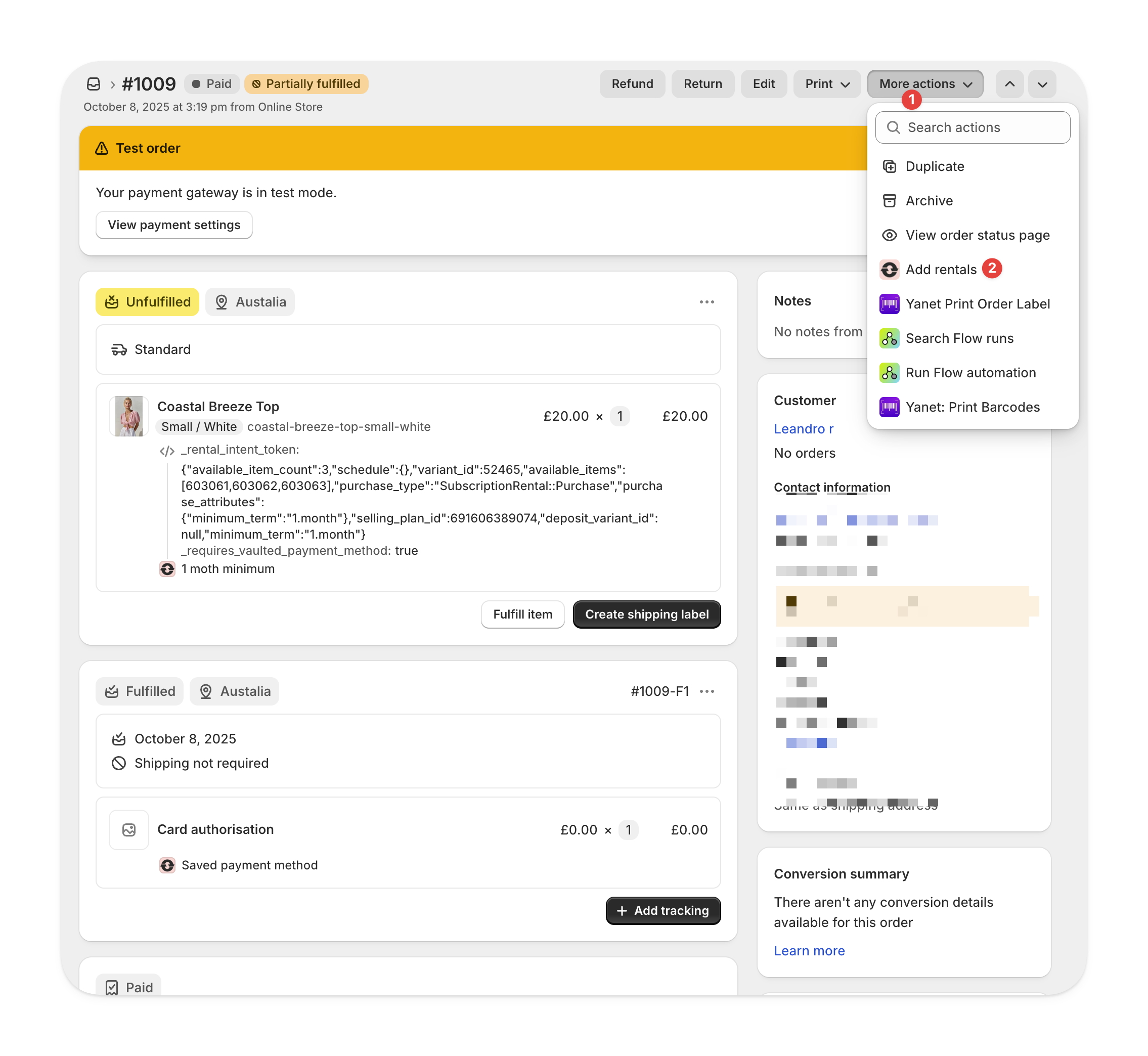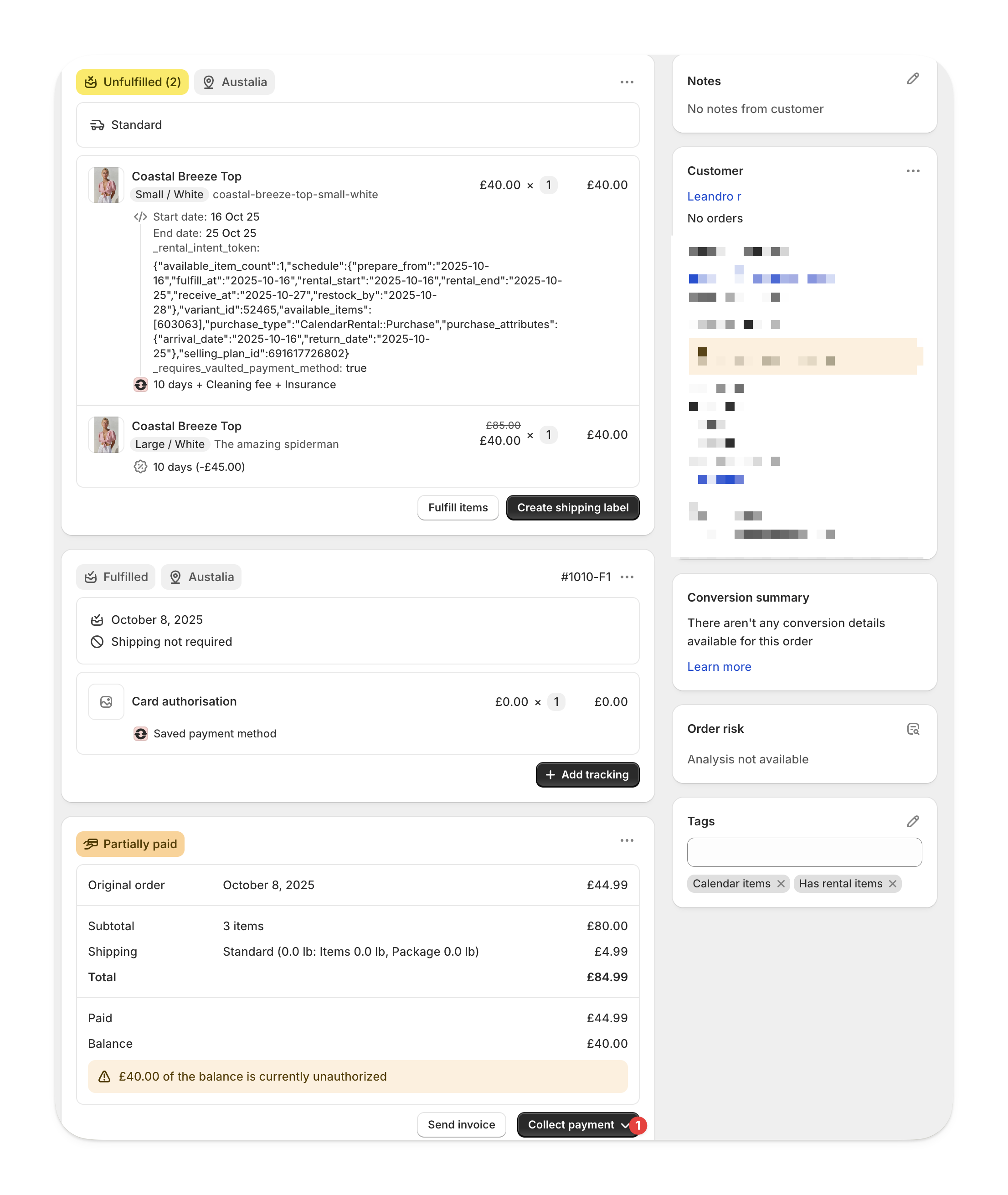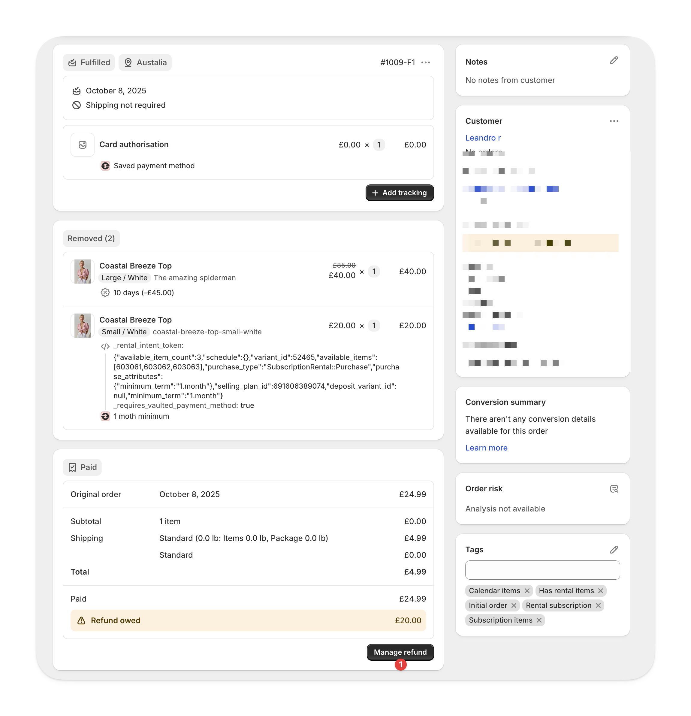 If adding rentals increases the total order value, Shopify will show the outstanding balance.Refunding the difference