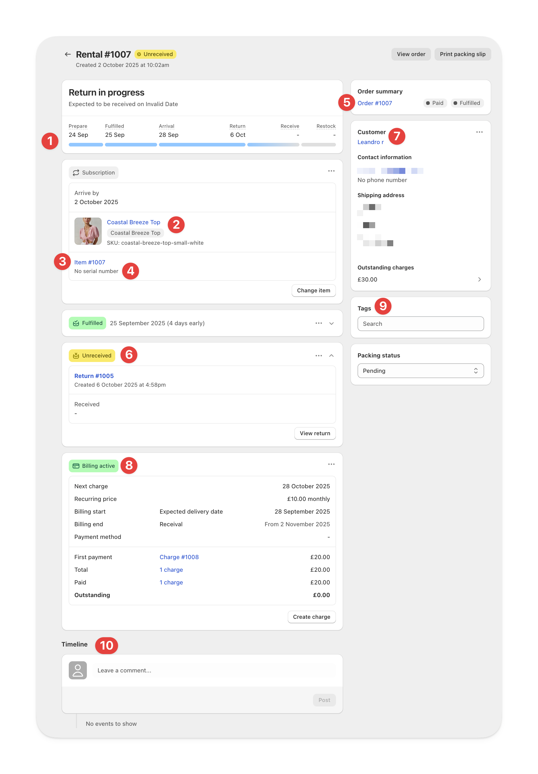 The Shopify order linked to this rental.Open it directly, view fulfillment details, or print packing slips.