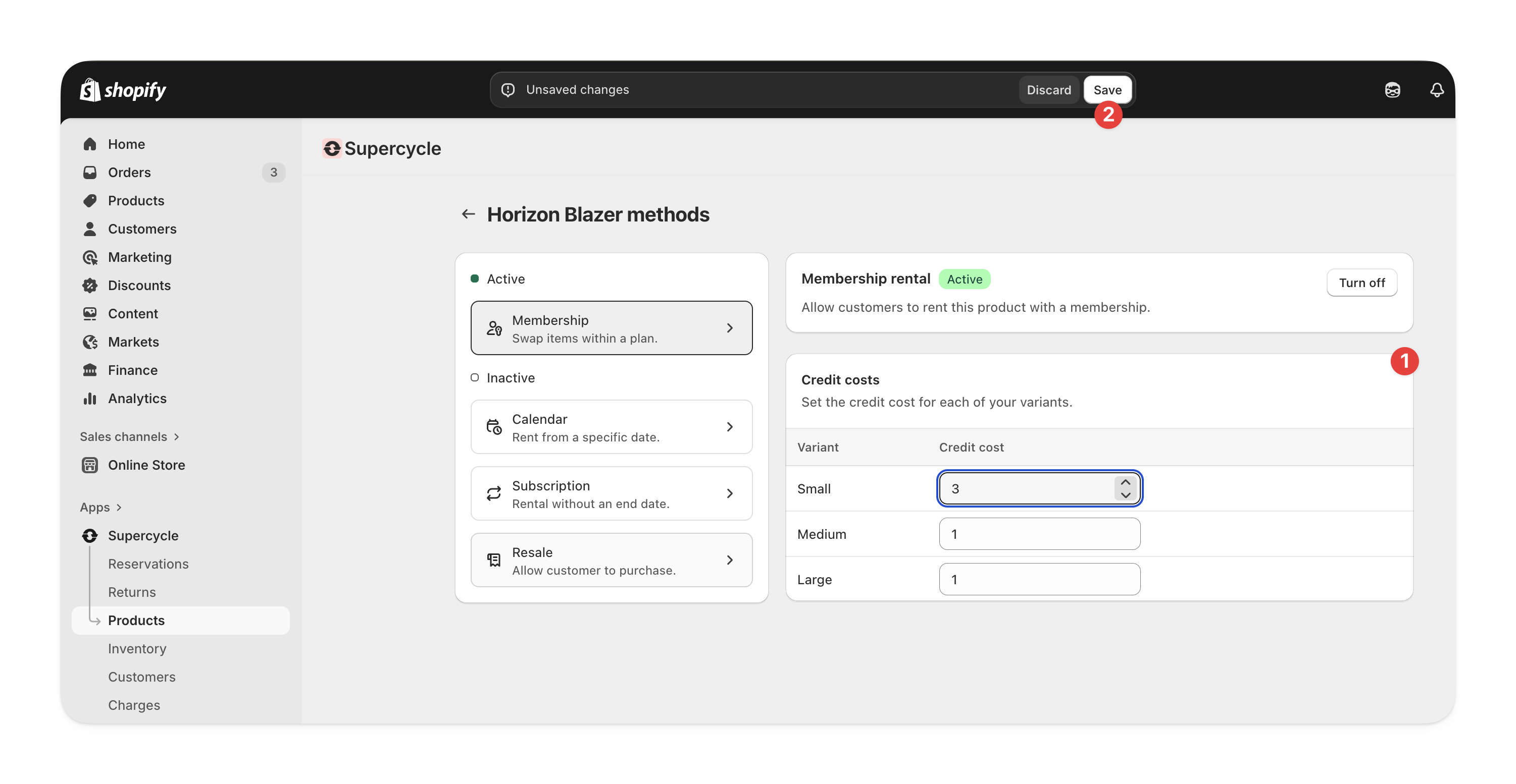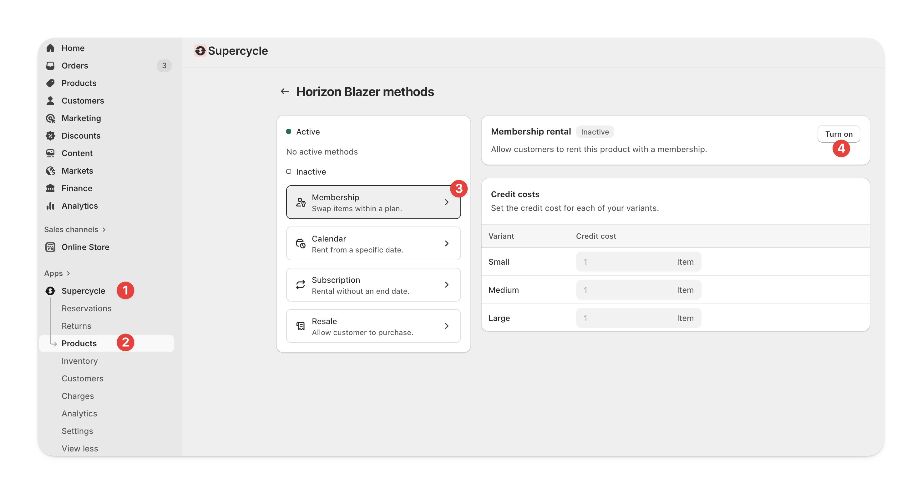 In your Shopify admin, navigate to Supercycle > Products.Select the product you want to set up and then select the Membership rental method.