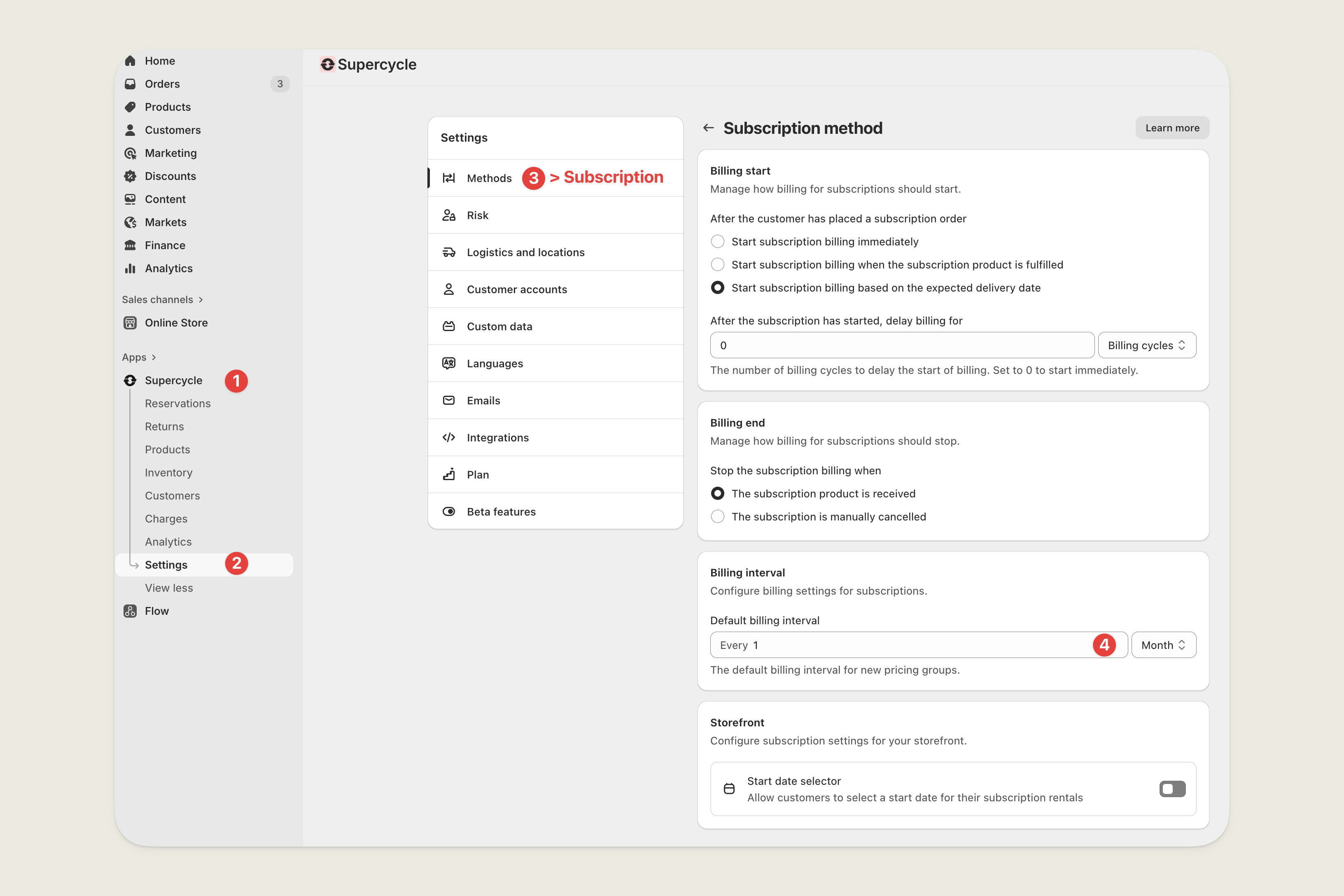 In your Shopify admin, navigate to Supercycle > Settings > Subscription rental.