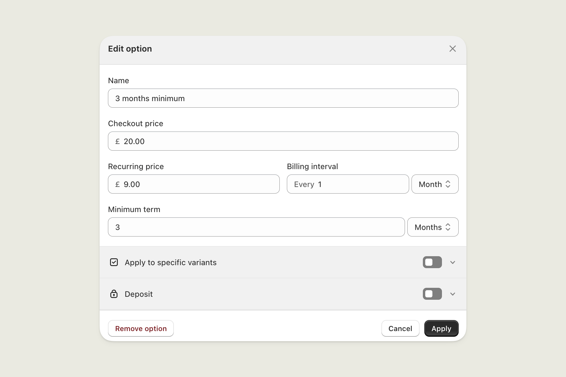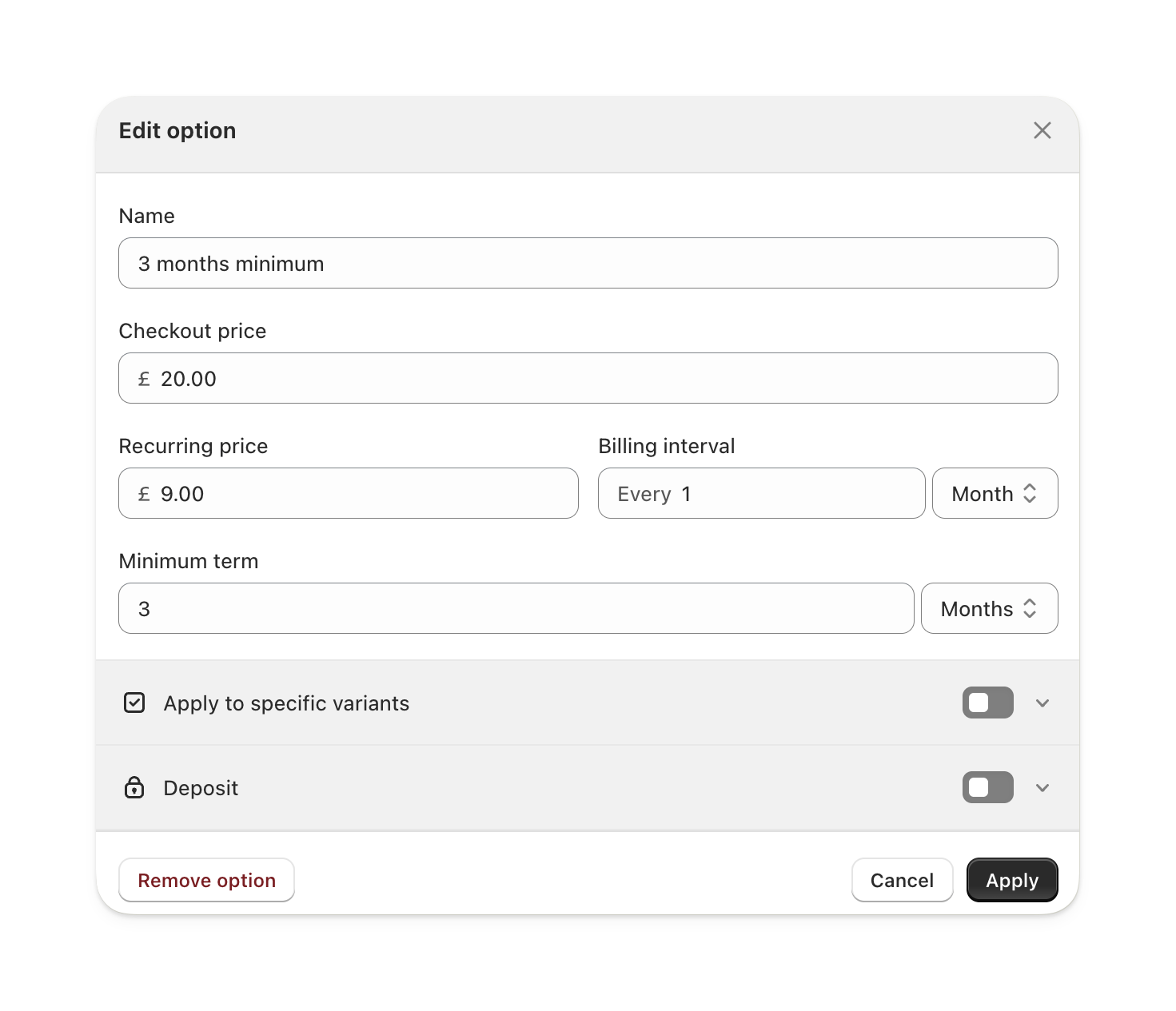 If you’ve created deposit amounts, you can select one here to be added to the cart with the subscription.