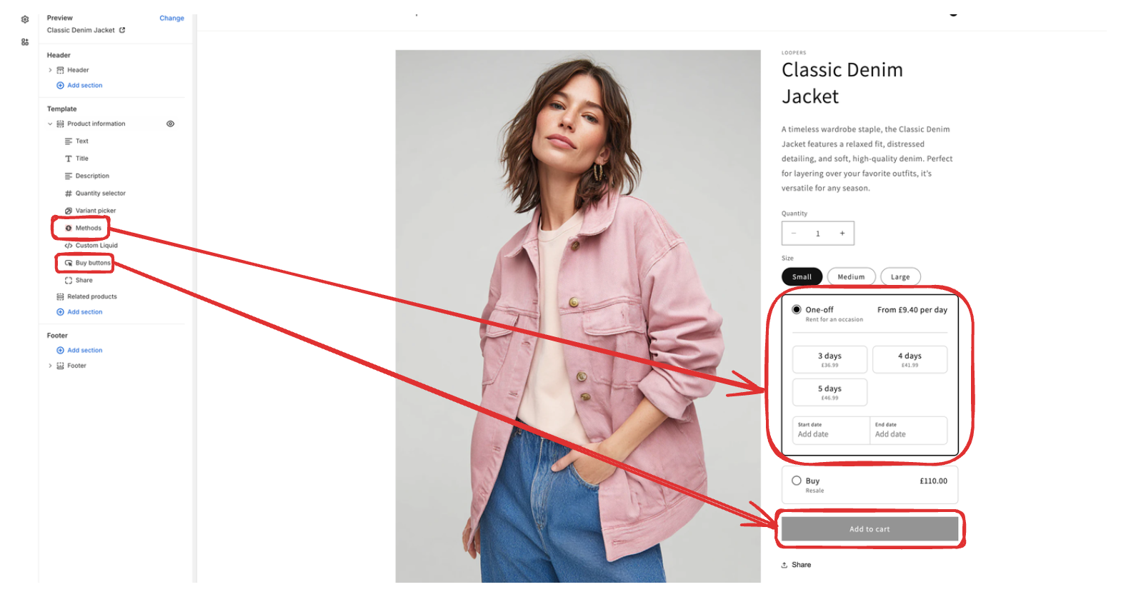 Supercycle’s customer-facing functionality is added to your theme as app blocks, allowing you to add rental functionality exactly where you want to use it on your store. At a minimum, you’ll need to add Methods app block to your product page.Update style settings